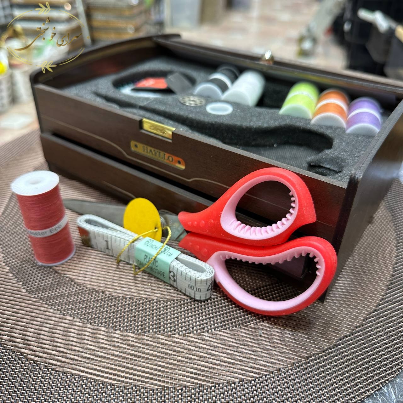 محتویات جعبه نخ سوزن و خیاطی چوبی هایلو مدل مازراتی کشو دار